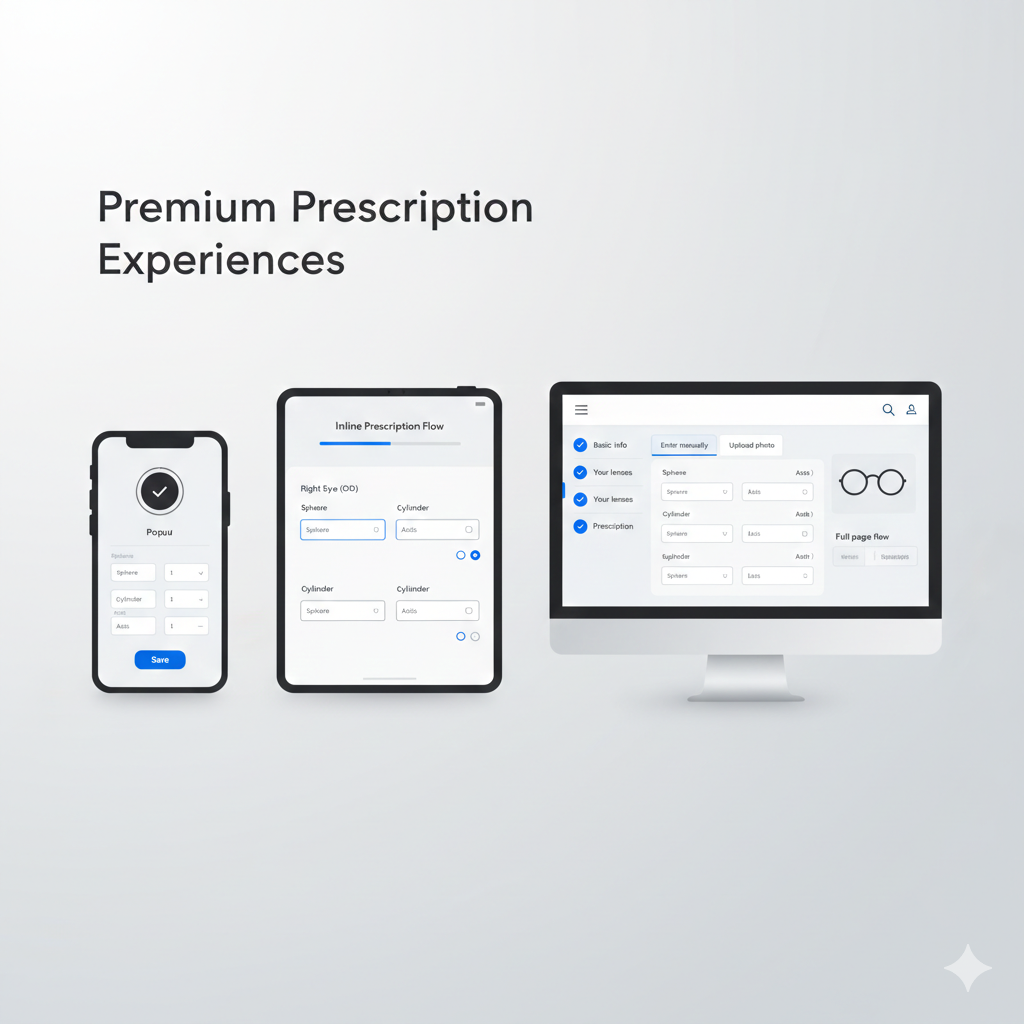 Offer your customers multiple high-end prescription entry experiences designed for trust, clarity, and conversion. VisioncarePro now includes 7+ professionally crafted layouts, giving you full flexibility to match your store’s design and customer journey.
